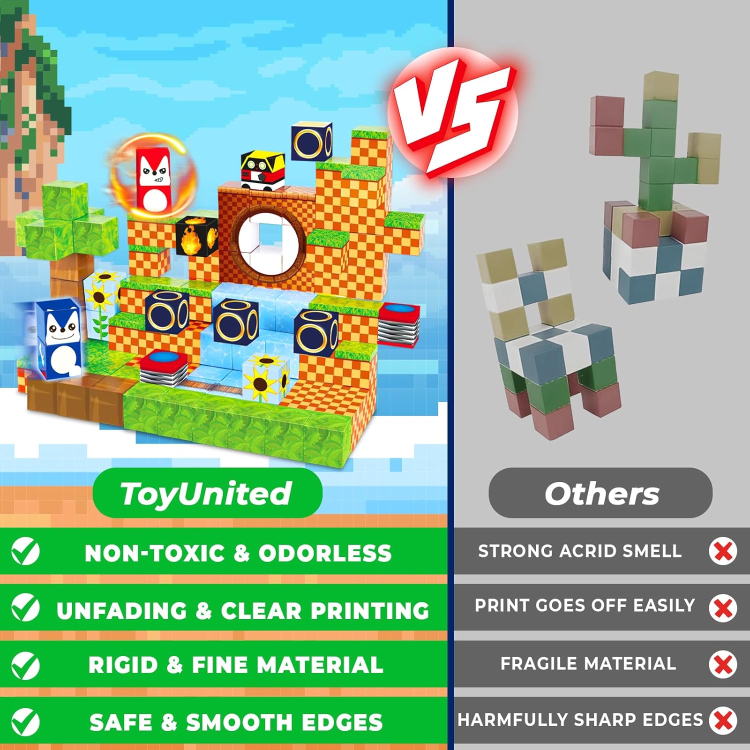 A diferencia de otros juguetes magnéticos del mercado, nuestro kit de cubos magnéticos cuenta con imanes internos, que facilitan a los niños de 6 años en adelante pegar los cubos y hacer construcciones resistentes.